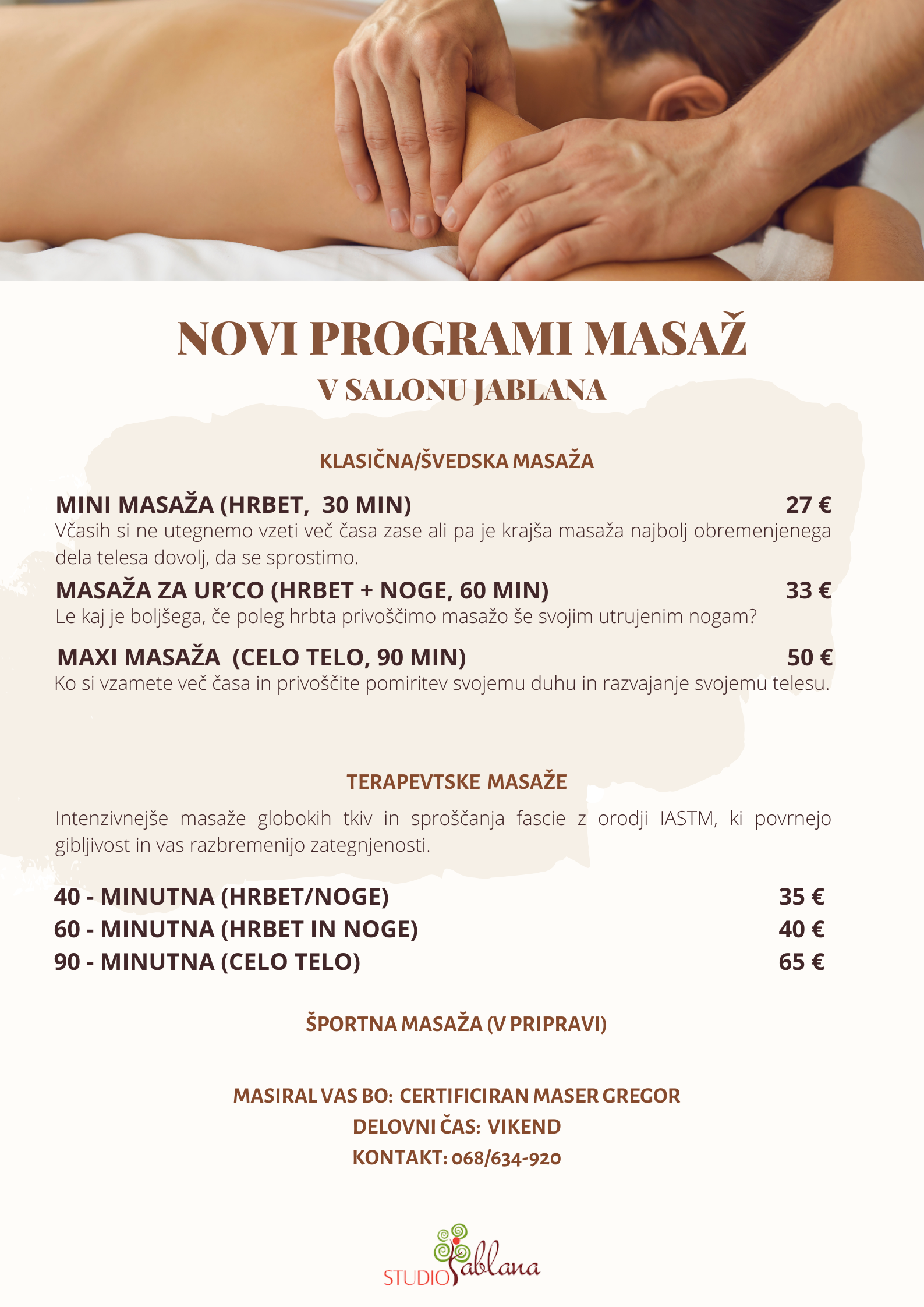 Ena najstarejših terapij je, da z dotikom ustvarjamo občutek telesnega in čustvenega ugodja. Pri masaži uporabljamo mnogo različnih tehnik, ki spodbujajo ali sproščajo mišice, izboljšujejo prekrvavitev in pospešujejo zdravljenje najrazličnejših tegob. To terapijo lahko uporabljamo tudi v kombinacji z aromaterapijo, saj ima vtiranje eteričnih olj v kožo velik razpon blagodejnih terapevtskih učinkov.